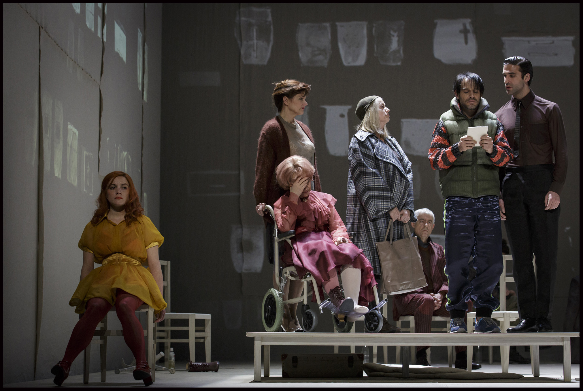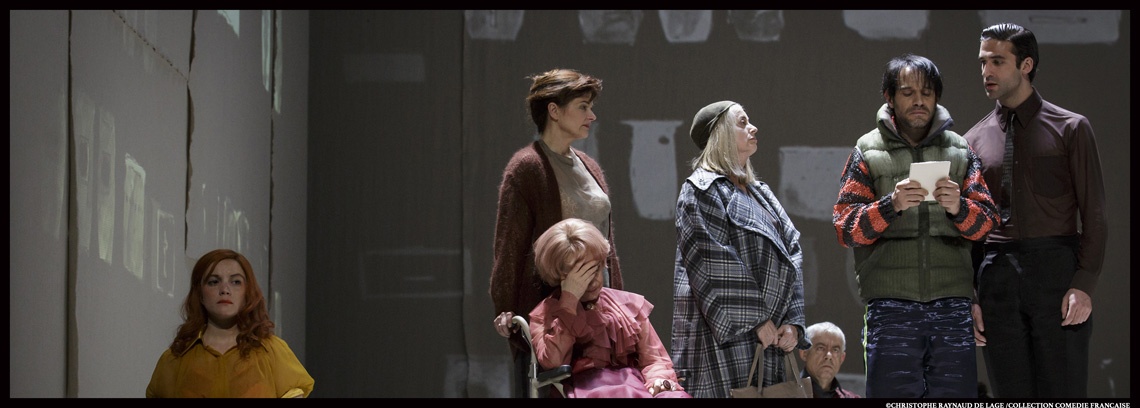 Le ton est donné dur et obscur. Dans cette cité froide et monochrome, la solitude et l’individualisme cohabitent réduisant à néant compassion et humanité. L’approche semble ardue, la tragédie presque installée. C’est sans compter le talent romanesque et empathique de la dramaturge allemande, Dea Loher, qui fait ici une entrée remarquée et fracassante au répertoire de la Comédie Française -c’est la première fois qu’un auteur allemand contemporain y inscrit son nom de son vivant après ceux illustres de Molière ou Racine. Loin d’aimer les écritures fluides et convenues, elle aime déconstruire, découdre, pour mieux réinventer les histoires de ses protagonistes. Tous différents, tous sur scène en attendant de s’exprimer, témoins muets et indifférents aux aventures des autres, enfermés, isolés face à leur terne existence attendant l’ultime délivrance, ils errent dans les rues désertes et tristes de cette ville imaginaire bordée par une mer grise et glaciale. Le sort est jeté. Ces êtres ont une part à jouer dans l’engrenage de la vie. Leurs destins vont se croiser et s’entremêler avec violence et malice.