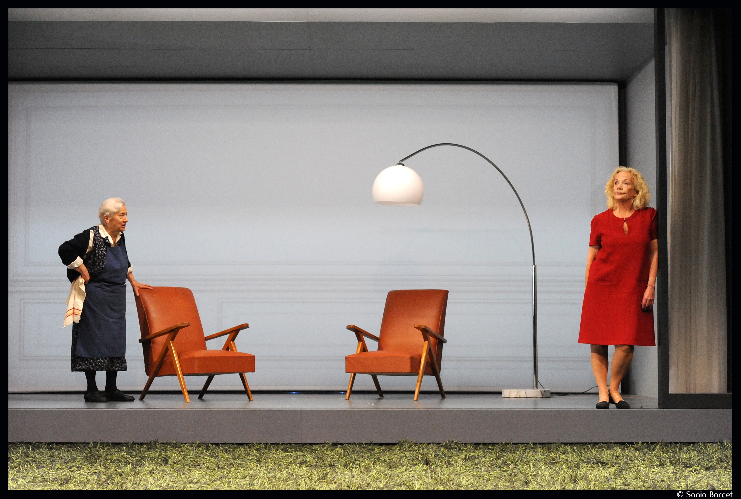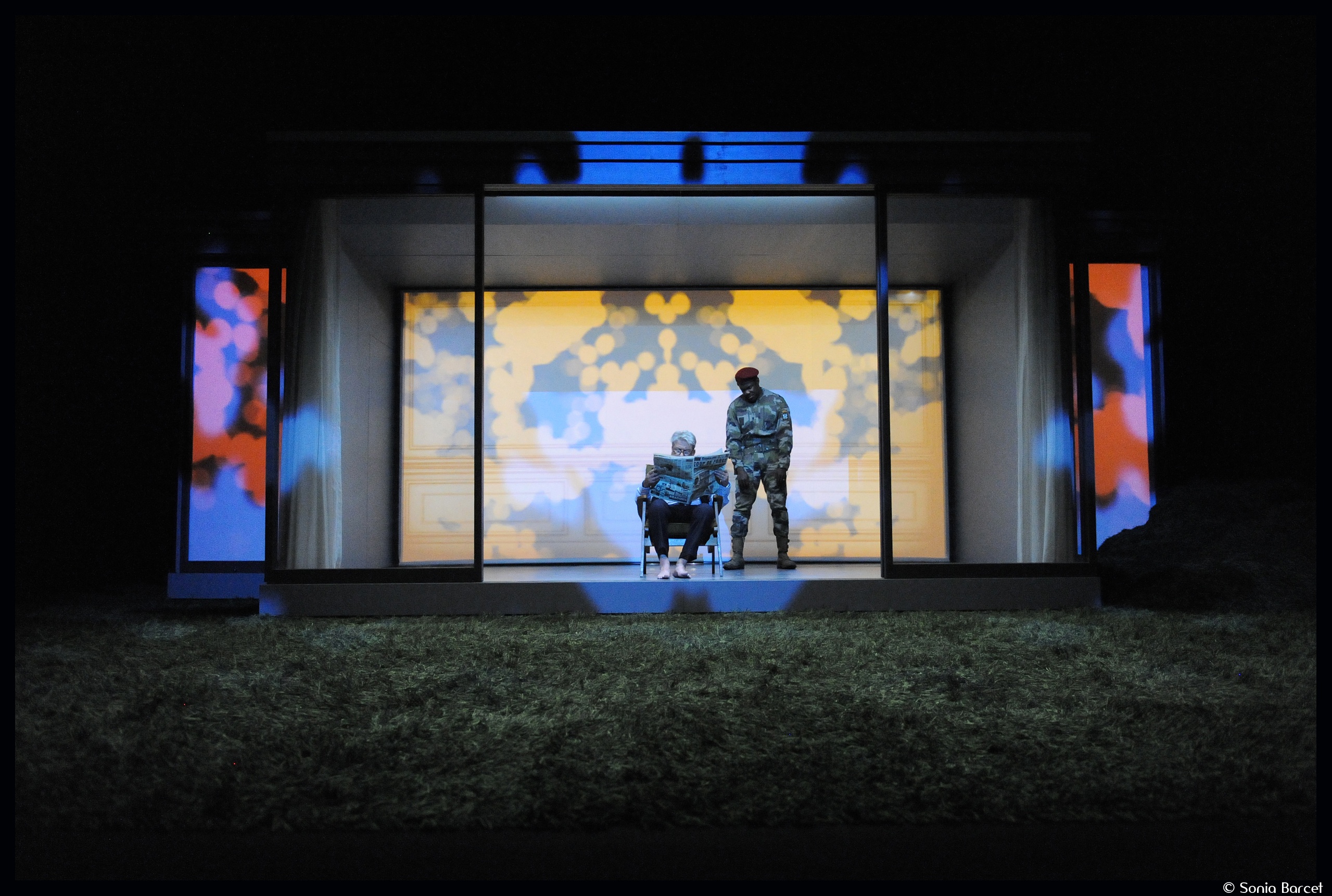 Une immense pelouse verte, luxuriante, recouvre la scène. Au fond, une grande baie vitrée symbolise une maison, totalement avalée par le jardin, sorte d’Eden protecteur, où les âmes innocentes sont calfeutrées, enfermées, afin qu’elles ne puissent pas être perverties par le monde extérieur, par sa fureur, ses cris, son immoralité. C’est en tout cas le souhait d’Adrien (épatant Didier Bezace), principal habitant des lieux. Homme pleutre et veule, petit notable de province, il tient ainsi son monde sous sa coupe : sa femme, alcoolique, et son fils, balourd et simplet (impressionnant René Turquois).