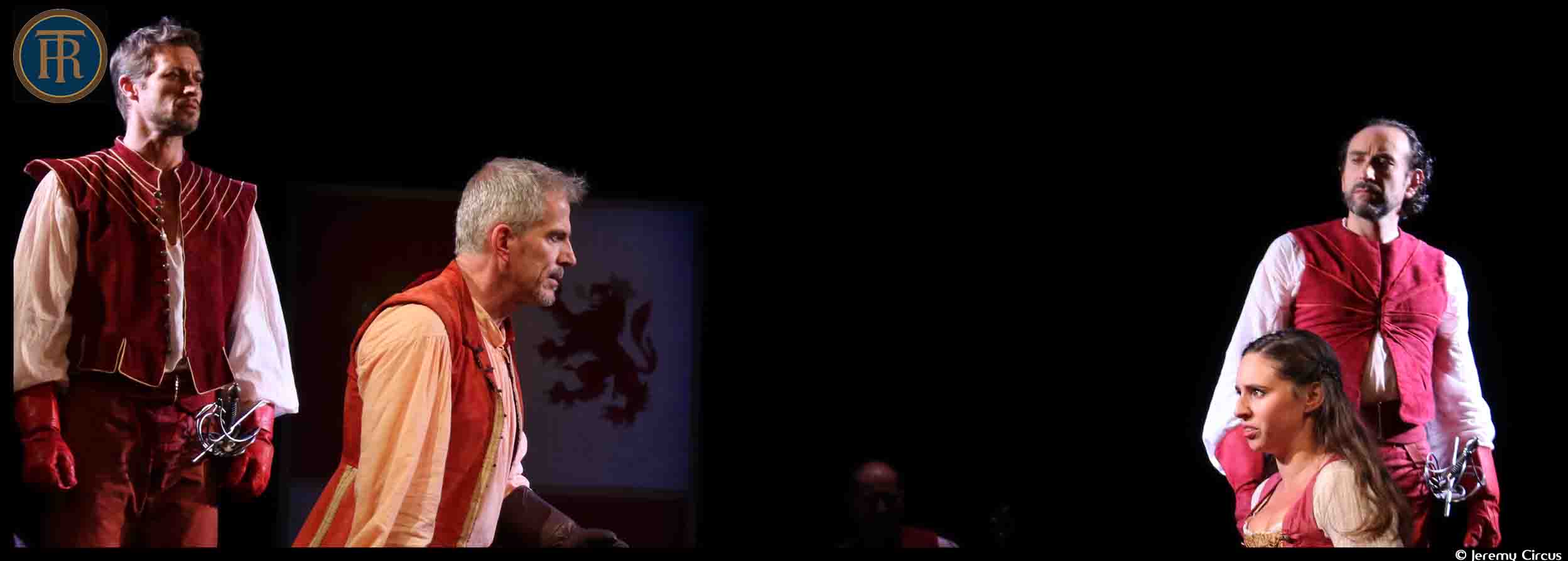 Accroché aux cintres du théâtre du Ranelagh, un blason, rappelant les armes de la Castille du Léon, domine la scène. Seul décor, il sera le témoin des amours contrariées et malheureuses de Chimène (Manon Gilbert énervante à souhait) et de Rodrigue (ténébreux et fougueux Thibault Pinson), tous deux descendants de deux nobles familles de ce royaume d’Espagne. Si les tourtereaux sont liés par une passion dévorante et brûlante, il semble bien que les rapports entre leurs pères sont plein de rancœur et d’animosité. Alors que le vieux père de Rodrigue (singulier Yves Roux) vient d’obtenir un poste prestigieux à la cour, celui de Chimène (Sombre et tonitruant Stéphane Dauch) ne décolère pas estimant être un meilleur choix. Un soufflet vient clôturer l’âpre discussion.
