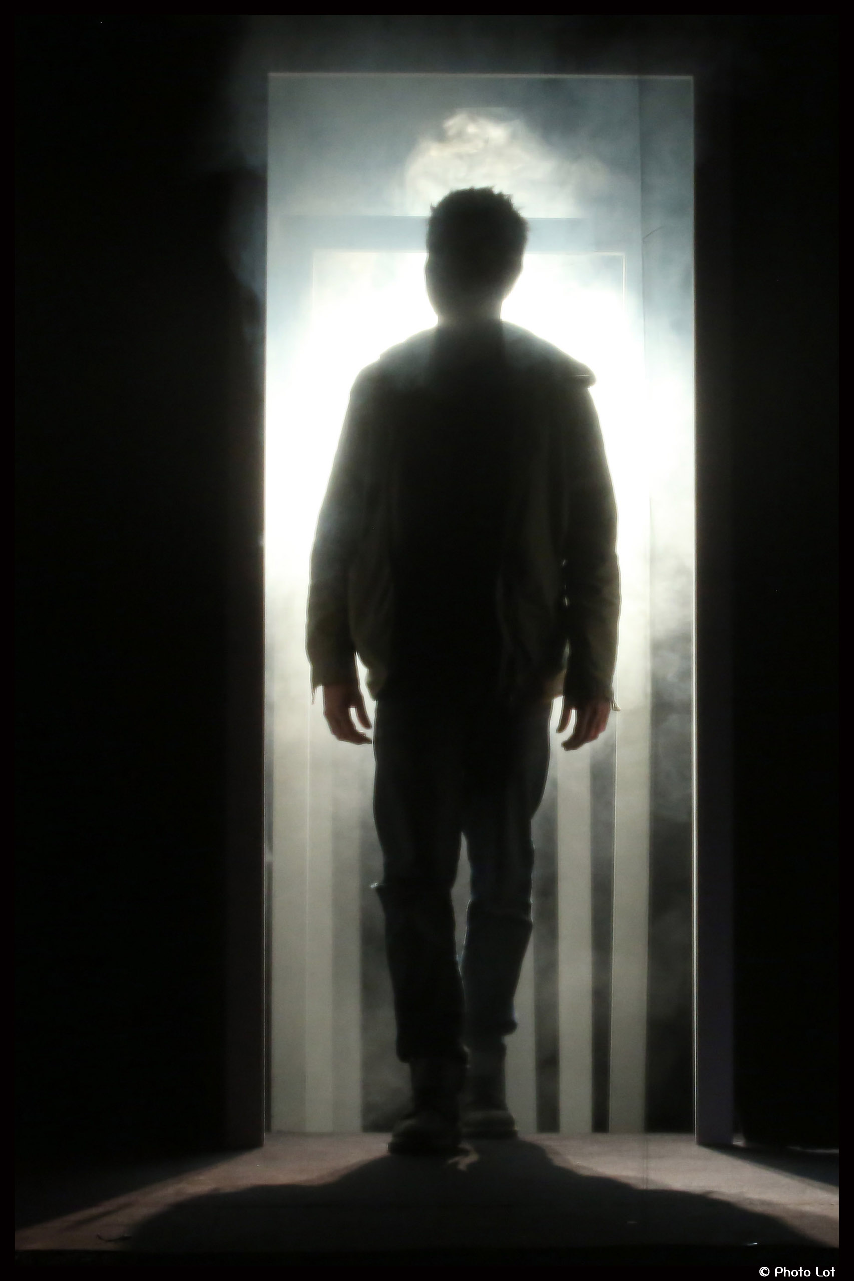 Deux silhouettes sombres, immobiles, une femme debout et un homme assis, sont placées de dos de chaque côté de la scène encadrant ainsi une porte dessinée par des néons. Au loin, dans un nuage de fumée, surgit une ombre. Spectrale, elle semble retenue par quelques démons invisibles et a bien du mal à avancer. De ce brouillard, un jeune homme (lumineux Audran Cattin) finit par s’extraire. Autour de lui, tout semble figé, le temps est suspendu. Le regard interrogatif, il a l’air perdu se demandant ce qu’il fait là, dans ce théâtre, sur cette scène. Inquiet, il se recroqueville.