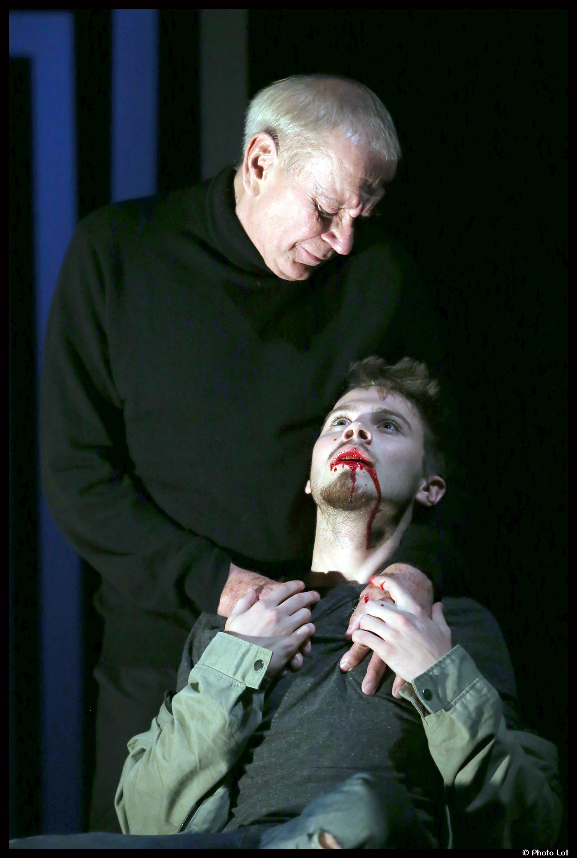 Très vite, le ton monte entre les deux hommes, l’un refusant la fatale issue que le second lui réserve soir après soir. Commence alors un bras de fer violent et féroce, où chacun défend ses droits, exploite les fêlures de l’autre. Si dans les premiers temps, le jeune homme semble se résoudre à embrasser son funeste destin, très vite les rapports s’inversent. Ne comprenant pas comment il peut préférer en finir avec ses jours, alors qu’il est heureux, il se rebelle représentation après représentation. Aidé par un régisseur (Grégoire Bourbier) qui ne supporte plus les mauvais traitements infligés par l’auteur à son personnage, il finit par trouver les failles du dramaturge. De cette guerre parricide, qui aura le dernier mot ? Tel est l’enjeu de ce huis-clos psychologique cynique, mortifère et drôle.