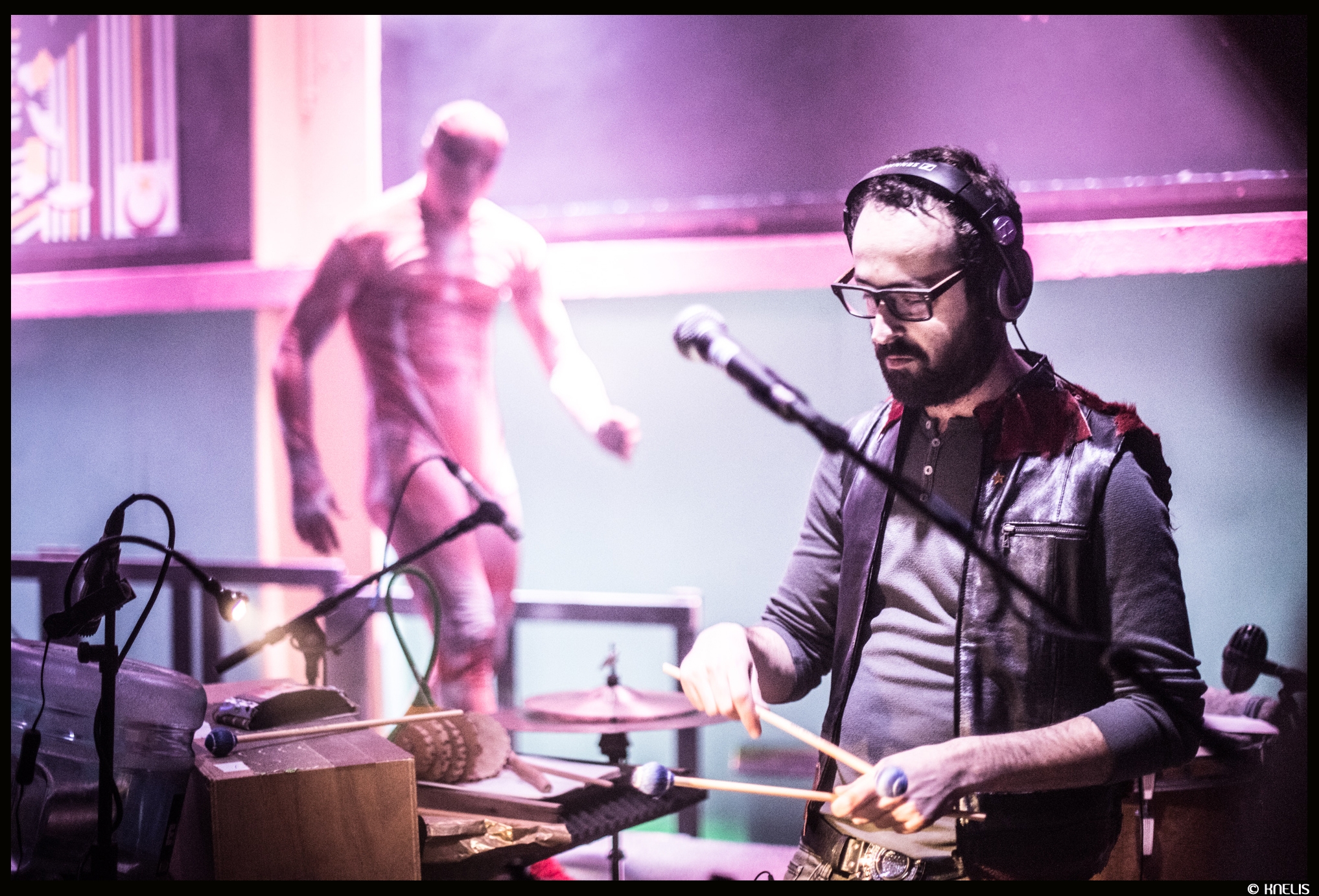 Petit à petit, la lumière se tamise, la musique s’intensifie. Une voix féminine rauque, lancinante, prenante, se fait entendre. Elle déclame une heure durant une sorte de poème au long cours. Les mots frappent, percutent. Ils parlent d’amour, d’extase, de vie, de rapports aux autres, de la différence entre l’homme et la machine. Les syllabes se détachent collant à la cadence de la boite à rythme. De chaque côté de la piste, les performeurs du Club Guy & Roni entrent dans la danse. Leurs corps volent, virevoltent, se contorsionnent et entrent en transe. Cette énergie extatique, qui se dégage de ces mouvements hypnotiques, se communie à un public chauffé à bloc.