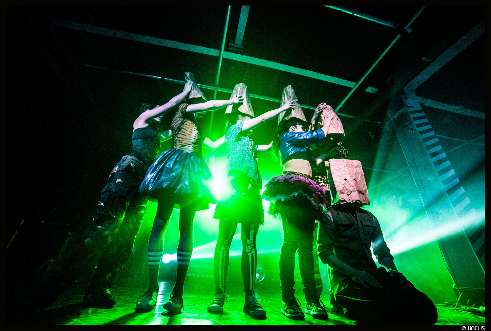 Alors que les spectateurs envahissent tranquillement le grand foyer et qu’une musique électro égrène sa rythmique, d’étranges créatures se mêlent à la foule. Un sculptural « black » en tutu salue les nouveaux arrivants. Un homme en manteau de fausse fourrure, portant en guise de couvre-chef, un magnifique plumage orange, s’invite dans les conversations. Une femme en robe de soirée noire, arborant un sublime collier fantaisie et des lunettes roses, s’immisce entre les invités de cette rave party singulière.
