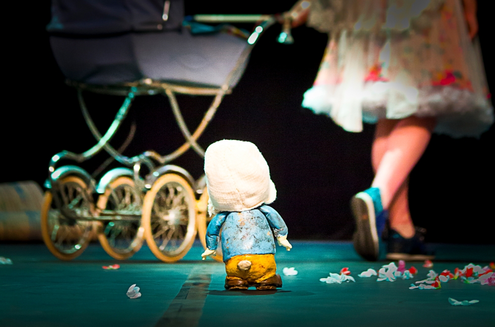 Dans un décor onirique fait d’objets récupérés dans quelques vides greniers ou quelques brocantes, une jeune femme (détonante Amélie Roman) conte son rapport à la maternité. Son nouveau-né dans un vieux landau, elle arpente la scène. Visage grimé, voix déformée, enfantine, elle a tout du clown. Elle s’amuse de ce nouvel état de mère. Elle présente sa famille, ses amies à ce petit être aussi attachant qu’encombrant. Si dans les premiers temps, le jeu, la découverte, l’enchantent, rapidement, les contraintes viennent perturber son équilibre, modifier sa vie d’avant.