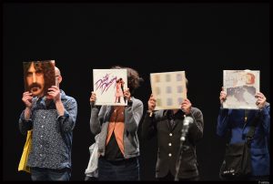 A peine le temps de prendre l’air, qu’il faut déjà foncer au Glob théâtre, où neuf quidams nous attendent pour nous faire partager un tube, un morceau qui les a profondément marqués. L’idée de Renaud Cojo est tout simplement géniale. Parti avec sa compagnie à la rencontre d’habitants-participants, comme il les appelle, il est entré dans leur intimité le temps d’une soirée. Chacun, l’un après l’autre, a organisé chez lui une écoute de son album fétiche. De cette expérience incroyable, unique, emplie d’émotions, il a imaginé un spectacle en forme de tranches de vie, où l’un après l’autre, à partir d’un souvenir, d’un émoi d’adolescent, d’une rencontre avec une musique, un style, une mélodie, se racontent. Le procédé, fort simple, répétable à l’envi, est d’une rare efficacité. Drôles, touchants, bouleversants, déjantés, les récits s’enchaînent faisant la part belle à la musique. Manière étonnante s’il en est de (re)découvrir des chansons inédites ou archi-connues, des artistes rares ou plus connus, 33 000 tours est une performance certes éphémère, une date pour l’instant, mais terriblement emballante. D’Elysian Shield à David Bowie en passant par la bande originale de Dirty Dancing à Durruti Column, le public se laisse emporter par le groove, le flow et ressort de l’expérience heureux, ravi, totalement séduit.