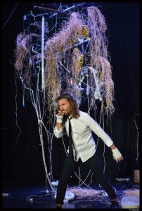 Colonnes de béton brut rappelant l’intérieur du palais de Tokyo, équipe souriante, bienveillante, la journée marathon peut commencer. Pas moins de cinq spectacles et un concert sont à l’affiche en ce deuxième jour de festival, autant dire qu’il n’y a pas de temps pour le farniente. C’est parti, direction le centre d’animation du Grand Parc situé à deux pas. Dans un décor apocalyptique rétro, un vieil aspirateur trône sur le devant la scène, dans des sortes de grandes cages, sont accrochés des prises électriques, des filaments de cordes et autres objets insolites, deux performeurs, un homme (Cédric Charron) et une femme (Annabelle Chambon), clones l’un de l’autre, mêmes habits, mêmes postures, mêmes cheveux longs déliés, observent le public s’installer. Dans cette aventure concoctée par Renaud Cojo, ils revisitent, avec un DJ, Suicide, le premier album du groupe Suicide. Gestes saccadées, bruits du quotidien, sons assourdissants – des bouchons sont offerts à l’entrée de la salle pour les oreilles sensibles, mots scandés, hurlés, ils nous plongent dans un univers punk, destroy, et restituent avec intensité jusque-boutiste l’ambiance d’une époque, d’un mouvement musical. Autant dire que ça pulse et ça déménage. Avec ce Ghost rider, le metteur en scène d’origine bordelaise signe un spectacle explosif porté par deux incroyables artistes.