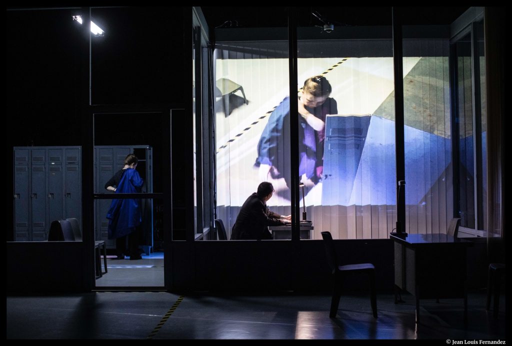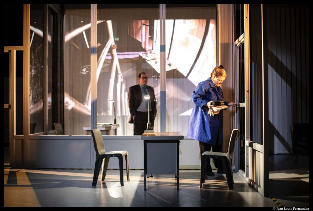 De multiples cloisons de verre partagent l’espace. Un mobilier neutre permet de déplacer l’action dans différents lieux, que ce soit dans un commissariat, au boulot ou tout simplement dans l’intimité froide d’un foyer. Derrière des stores vénitiens blancs, qui s’ouvrent lentement, on aperçoit une silhouette imposante, majestueuse. C’est celle d’Anne Benoit. Regard dans le vide, absente, elle décline son identité sans joie mais sans peine non plus. Elle s’appelle Sylvie, elle a 53 ans, elle travaille dans une usine de Caoutchouc. Elle n’a pas grand-chose à dire. Elle est simple. Sa vie est sans surprise. Séparée depuis un an, elle n’a pas de colère en elle. Elle s’est blindée depuis longtemps. Elle se contente du peu qu’elle a.