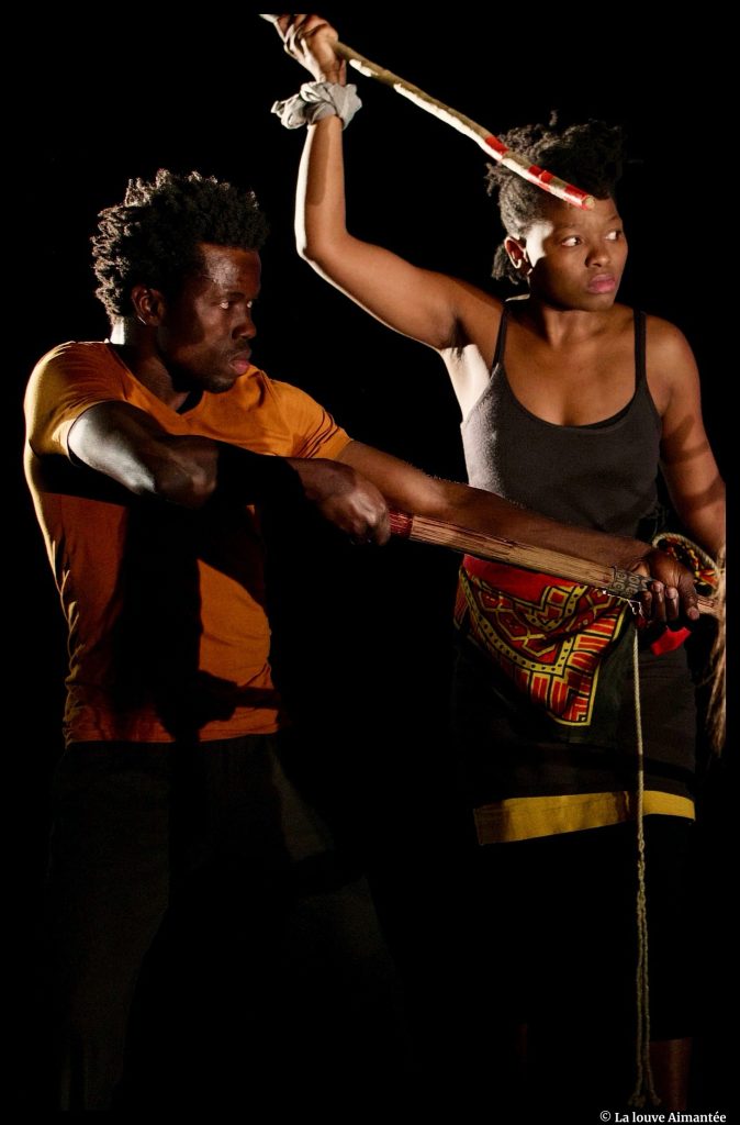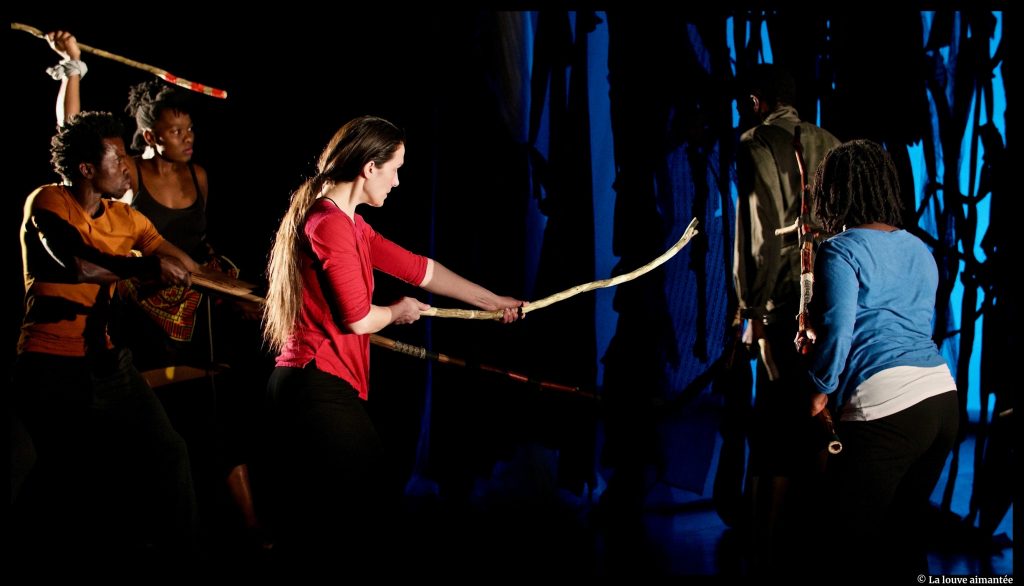 Florence Bermond : Six mois ont été nécessaires pour constituer l’équipe. Je souhaitais travailler en priorité avec des actrices et des acteurs congolais. Les artistes réunis (RDC, Togo, France, Burkina Faso) se sentent concernés et engagés face à ce sujet. Le corps est le point de départ de mon travail avec les acteurs. Les états de corps proposés lors des improvisations, le travail du sabre conduit par Audrey Marquis Evalaum (spécialiste du sabre traditionnel japonais et chorégraphe) demandent aux acteurs de la précision, la recherche d’une réelle qualité de mouvement et de présence, un engagement physique de chaque instant. Cette approche me semble profondément juste pour raconter l’inaudible de la guerre, l’élan vital des corps insoumis, les cris et les chuchotements d’un chœur en mouvement qui nous raconte la fragilité et la force de la vie.