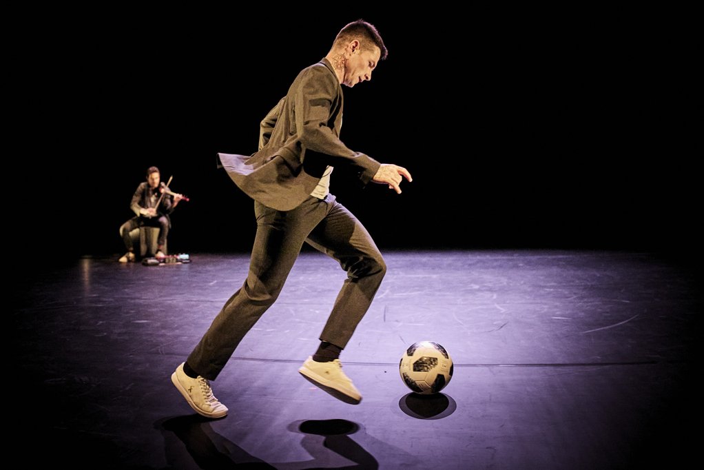 La bonne idée ? Faire dialoguer cet as du foot freestyle et le violoniste Gabriel Majou avec lequel le chorégraphe a déjà travaillé lors de la création de Vïa pour le Ballet du Grand théâtre de Genève. Comme dans toute rencontre, chacun part à la découverte de l’autre avec ses habitudes, ses réflexes et le rapport intime qu’il entretient avec son prolongement de lui-même, le ballon pour l’un, le violon pour l’autre. Les percussions de l’un entrent en résonance avec les frottements de cordes de l’autre. Les deux artistes apportent leur part à cette partition qui s’écrit sous nos yeux. Leurs énergies s’accordent à l’unisson.