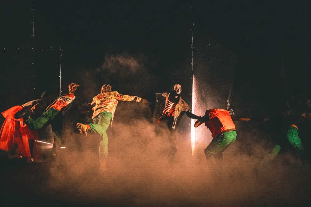 Dès les premières minutes, le ton est donné. Un solo poétique de guitare électrique ouvre le bal de ce manifeste scénique, suivi de l’irruption d’une bande punk et goguenarde – les sept camarades du défunt John Kaltenbrunner, figure centrale de la révolte. Ils dédient leur performance aux « torchons, aux boueux, aux raclures de bidet de ce monde », et remercient ironiquement tout ce qui a rendu le spectacle possible. Tout d’abord la directrice du théâtre, puis les pompiers, leurs grands-mères, Vincent Bolloré (« pour l’inspiration »), le Puy-du-Fou, les enfants en Afrique (« pour les métaux rares »)… Nihilisme, ironie grinçante, rage et autodérision : la machine est lancée.