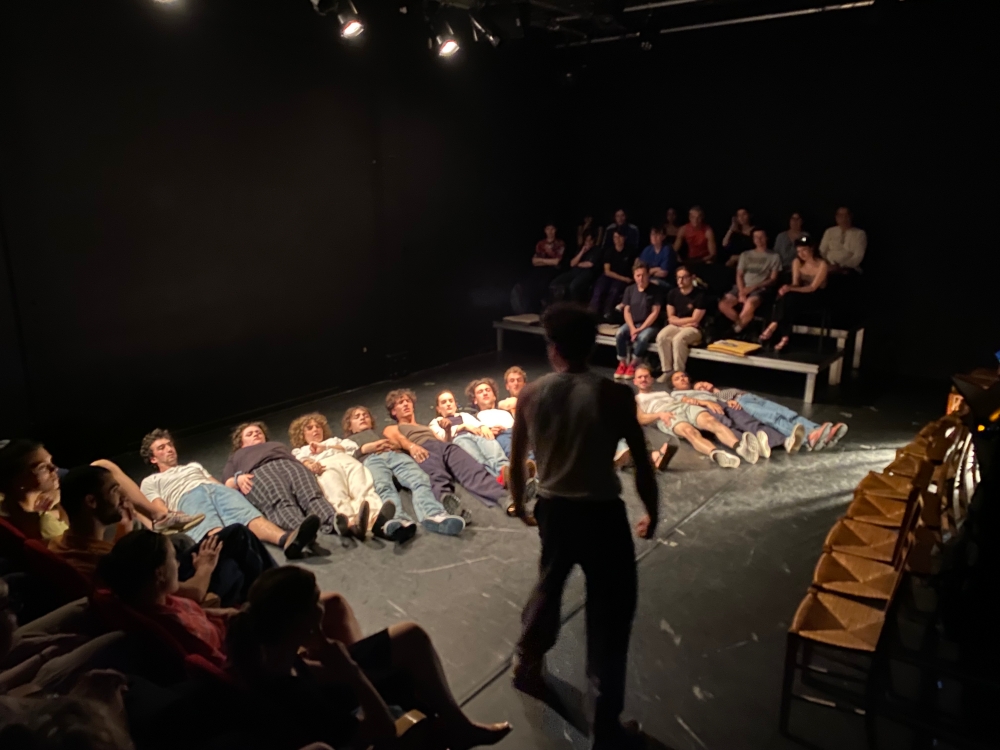 Avec les élèves-acteurs de la Promotion Minyana du « Temps du Jeu » du Thélème Théâtre École : Yvon Chagué, Léopold Couderc, Gloria Deparis , Anna Gayat, Victor Gérard, Audrey Guinot, Juliette Jacquemard, Jules Mense, Lucas Miailhes, Robin Peralta Hidalgo, Zoé Rambaldi, Alexis Rosenstiehl, Sarah Walker et Mazal Brakha