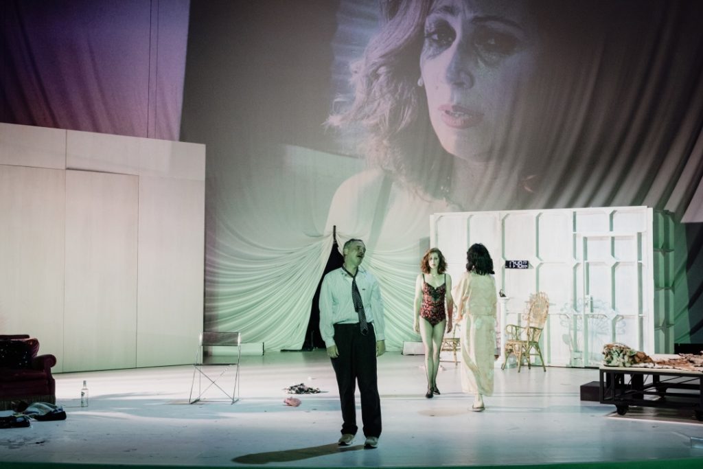 Ainsi de Maggy, campée par un comédien travesti et plus caricatural que jamais ; ou de cette employée d’hôtel, perruque noire sur la tête, qui entre et sort mille fois de la chambre en roulant des hanches jusqu’à l’absurde. Las, ces personnages, caractérisés à la limite du kitsch, apportent peu à l’intrigue. Ils saturent, en revanche, la mise en scène.