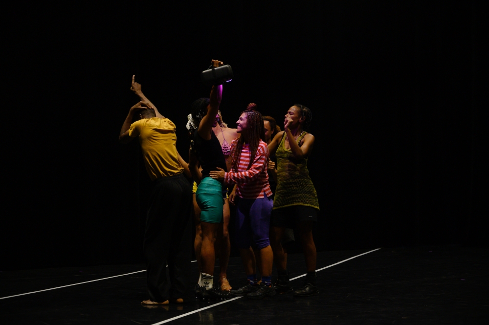 Les pulsations répétitives, les déflagrations sonores viennent animer les corps, les poussent à une intense physicalité. Le chorégraphe semble répondre au compositeur par une façon brute de faire monter l’énergie jusqu’à la transe. Progressivement, le groupe se densifie. Les corps, comme enchaînés les uns aux autres, se déplacent dans un mouvement d’émancipation plein de fureur. Cette façon nous donne à voir et ressentir ce quilombo contemporain éphémère, voué à disparaître une fois les lumières rallumées, qui constitue le moment le plus puissant de Bruits marrons.