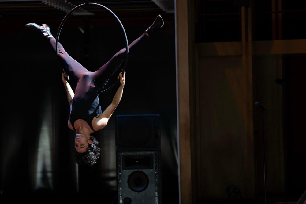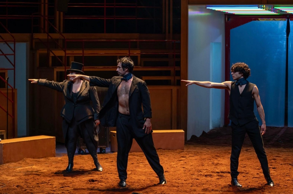 Christophe Honoré demande aussi à chacun d’imaginer un numéro de cirque. Davide Rao choisit le cerceau aérien. « Je n’en avais jamais fait, mais j’ai un passé de sportif, et une amie qui pratique régulièrement le cerceau. Avec son aide, je me suis entraîné tout l’été. » Suspendu dans les airs, il ouvre le bal de Bovary Madame, dont la mise scène circassienne est fortement inspirée du Lola Montès de Max Ophuls. Il y incarne un Léon en apesanteur, corps tendu entre désir et vertige.